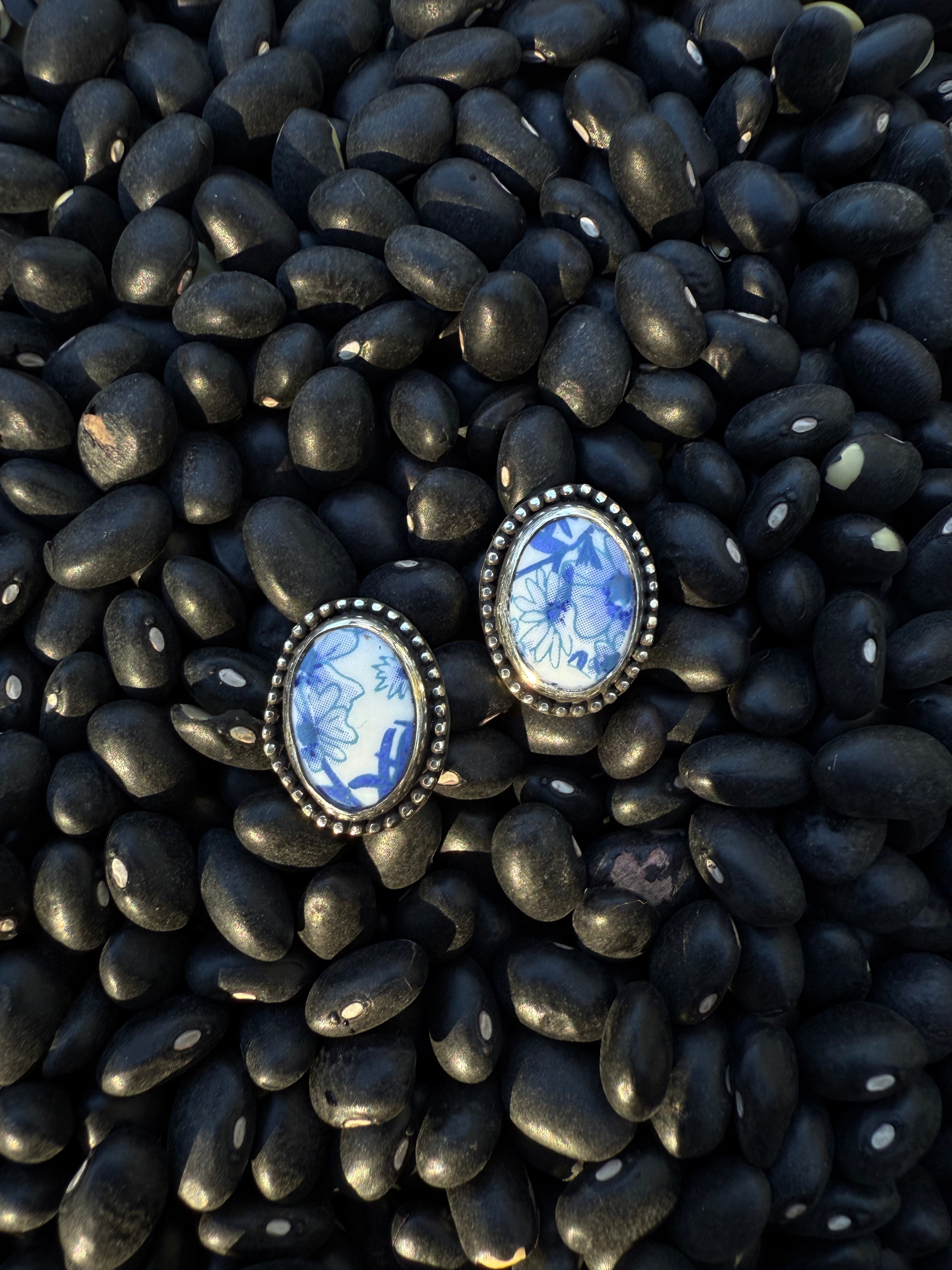Handcrafted in sterling silver, these oval studs feature delicate porcelain cabochons with soft blue floral details—like tiny painted keepsakes. Lightweight... Read more