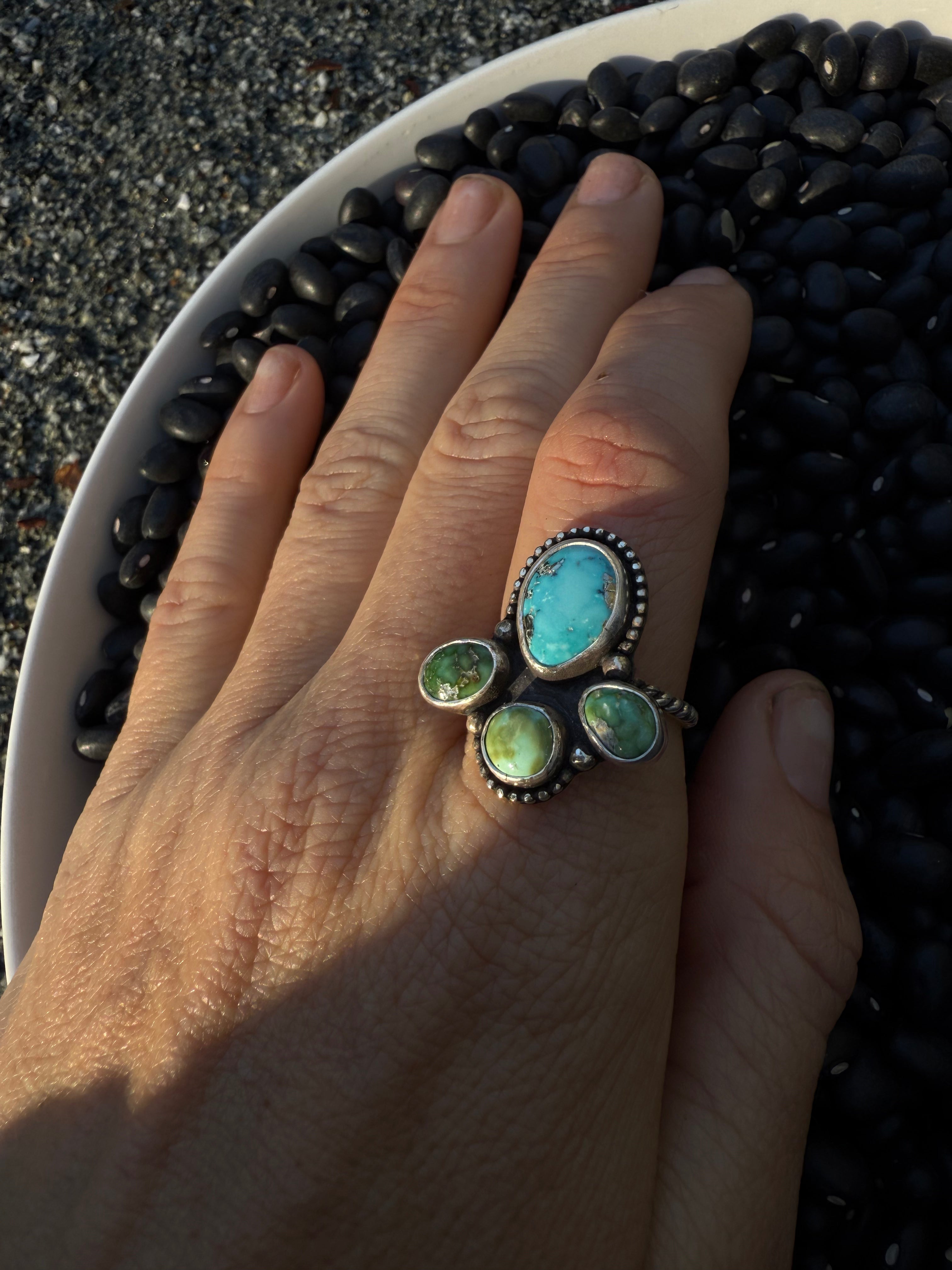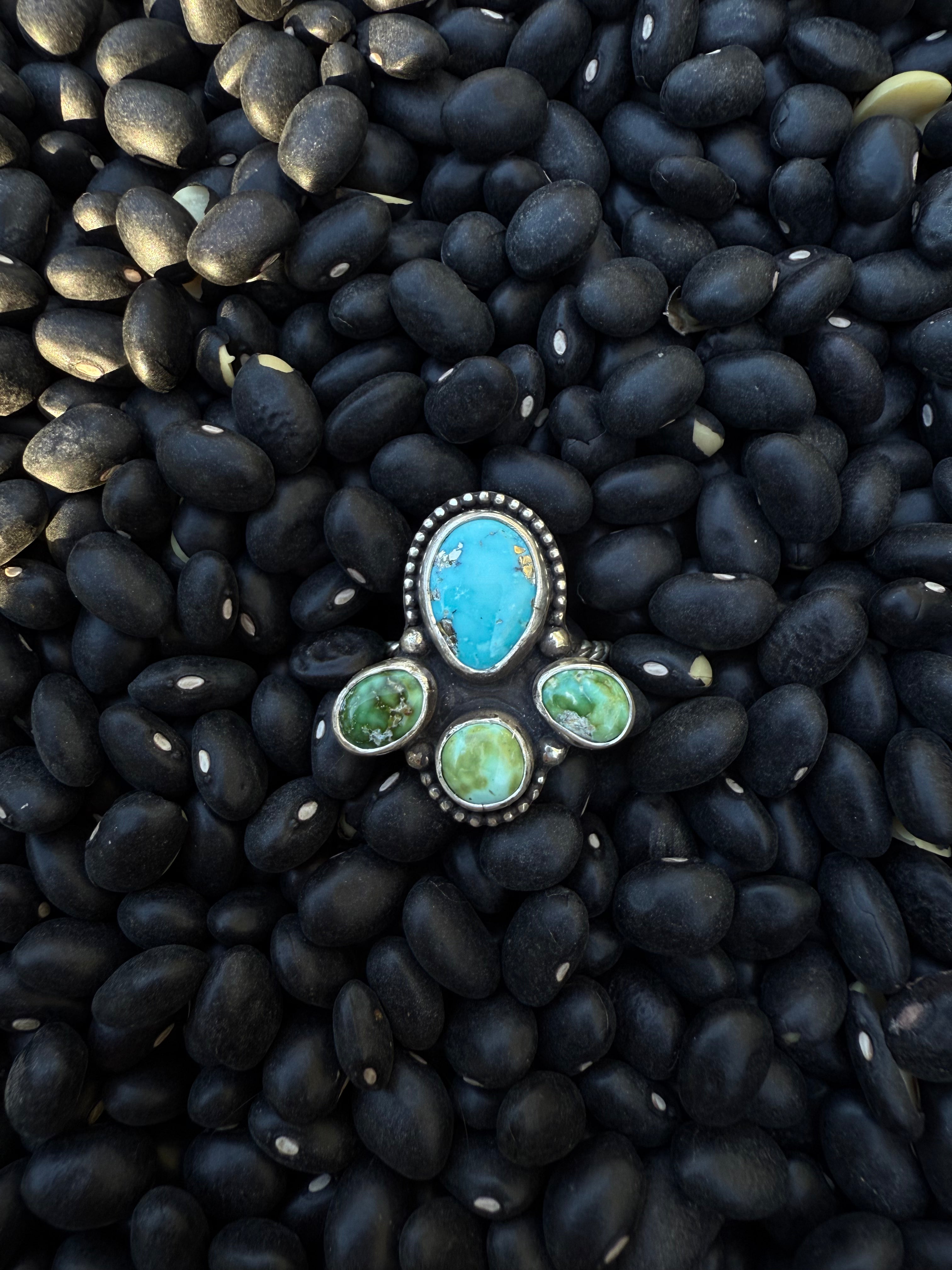 A true desert duo, this sterling silver ring pairs a bold Morenci turquoise centerpiece with three glowing Sonoran turquoise cabochons.... Read more