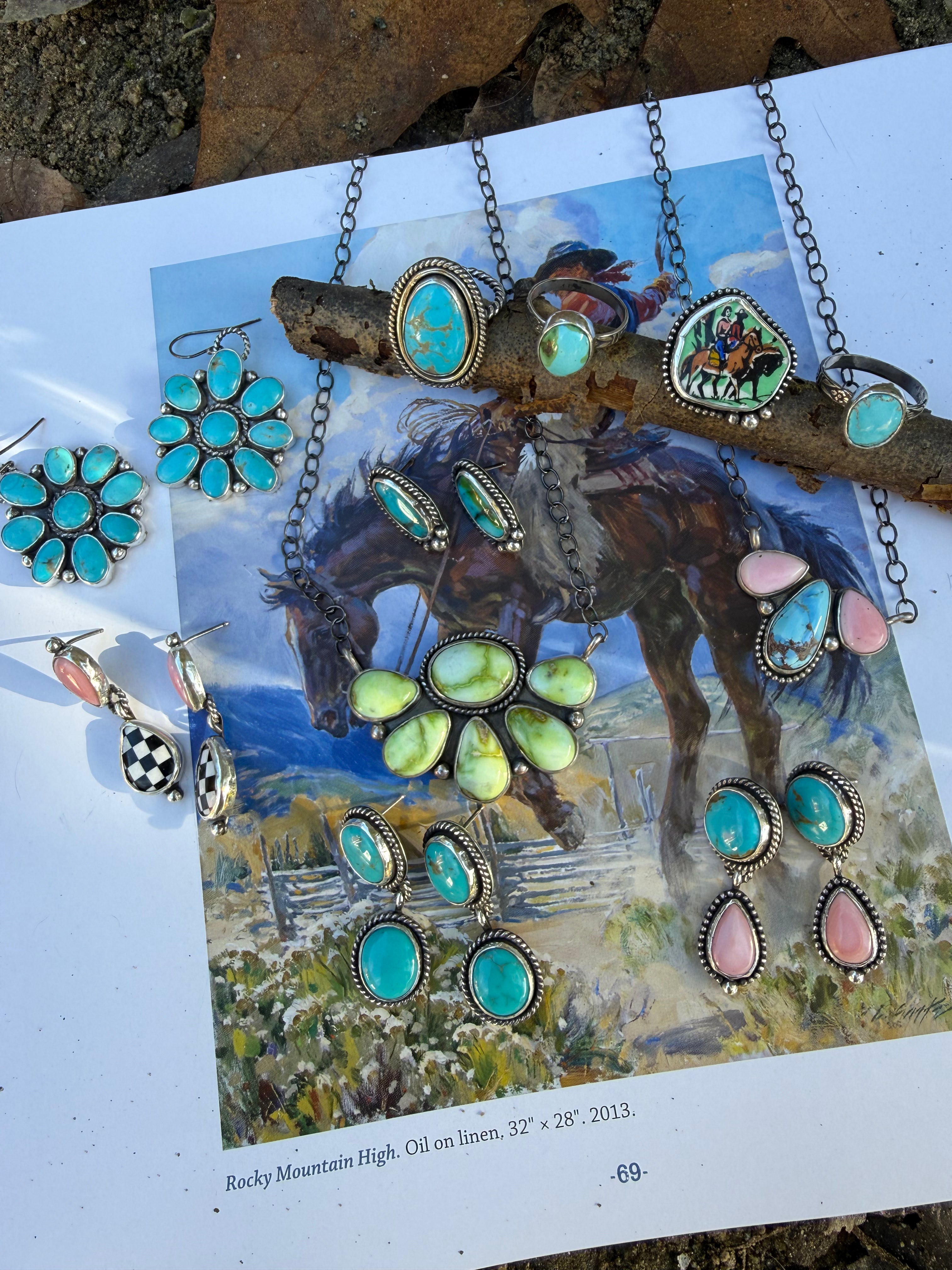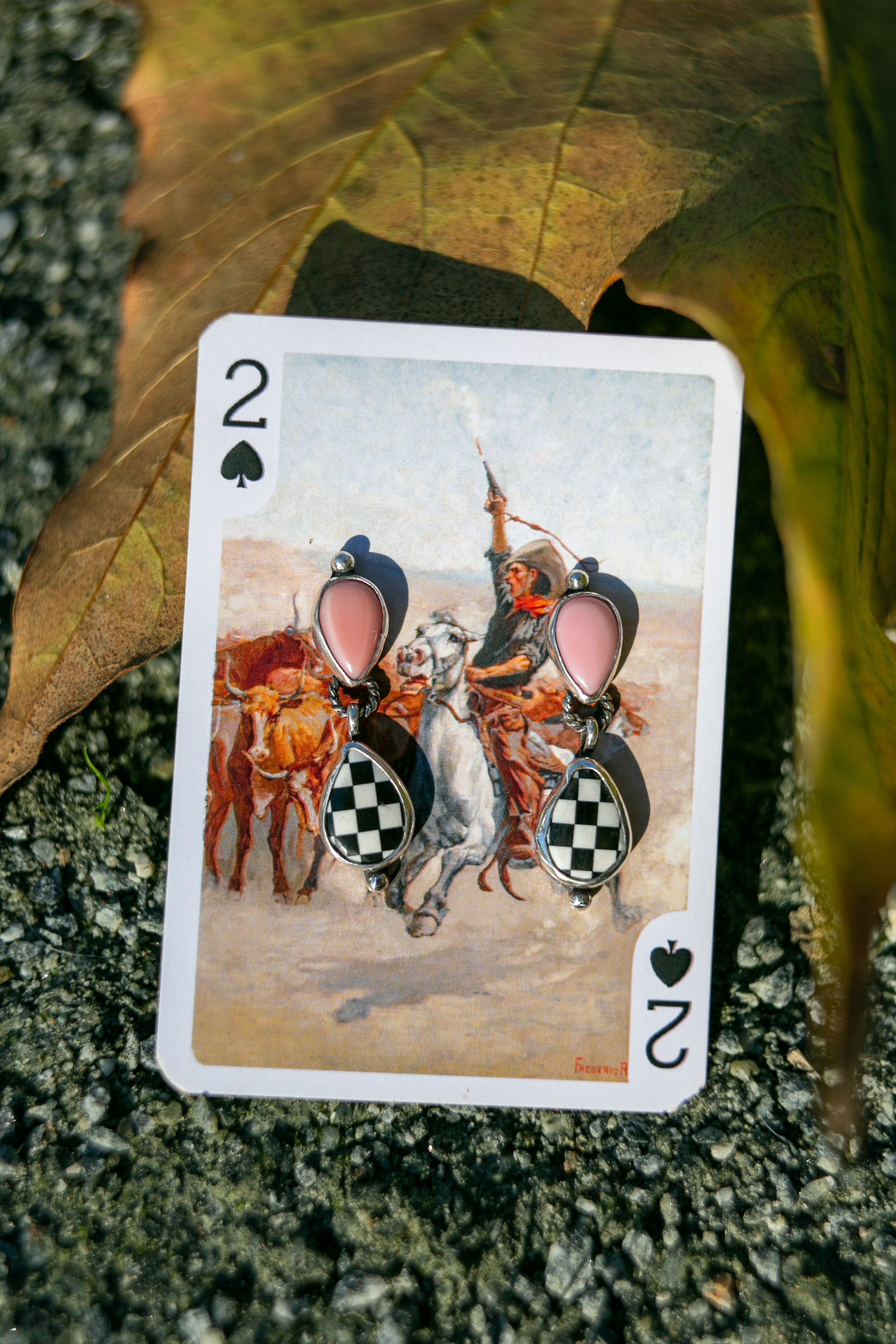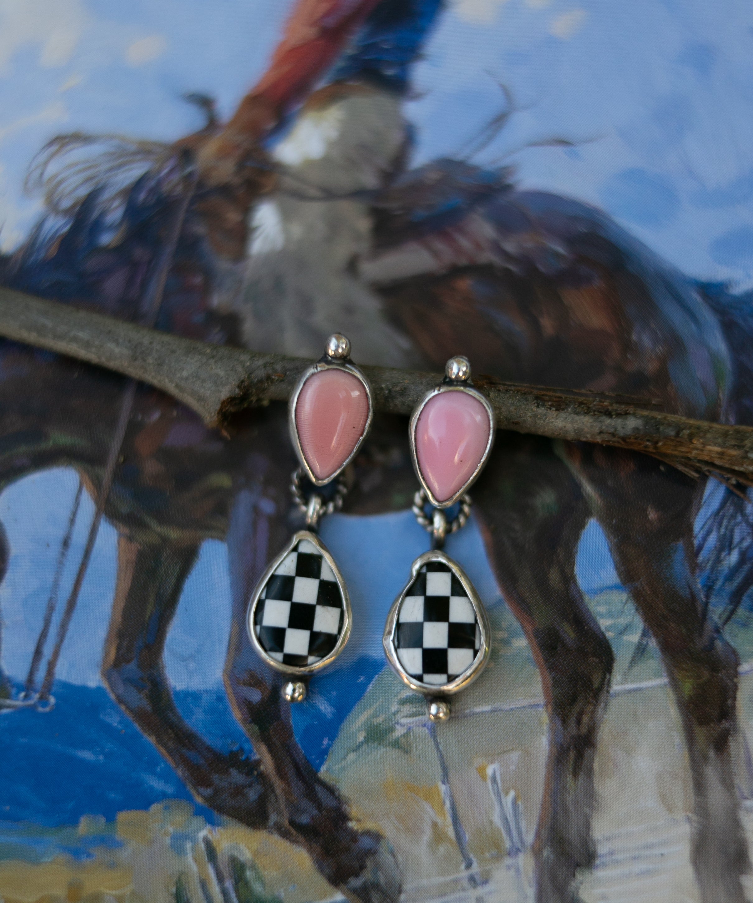Soft pink conch studs anchor the design, finished with a swinging checker inlay dangle that adds movement and contrast. The...